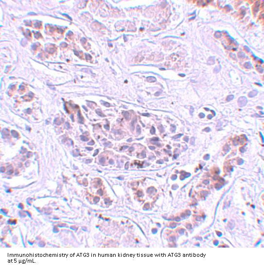 ATG3 Antibody: Autophagy, the process of bulk degradation of cellular proteins through an autophagosomic-lysosomal pathway is important for normal growth control and may be defective in tumor cells. It is involved in the preservation of cellular nutrients under starvation conditions as well as the normal turnover of cytosolic components. This process is negatively regulated by TOR (Target of rapamycin) through phosphorylation of autophagy protein APG1. ATG3 (APG3) is a widely expressed conjugating enzyme for APG8 lipidation, an essential step for the initiation of autophagy. It functions as an E2-like enzyme during the initial stages of autophagosome formation by catalyzing the formation of the Atg8-phosphatidylethanolamine (Atg8-PE) conjugate, which is critical for autophagy.