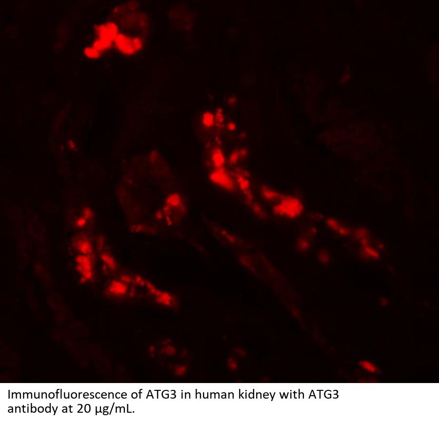 ATG3 antibody can be used for detection of ATG3 by Western blot at 1 - 2 μ g/mL. Antibody can also be used for immunohistochemistry starting at 5 μ g/mL. For immunofluorescence start at 20 μ g/mL.