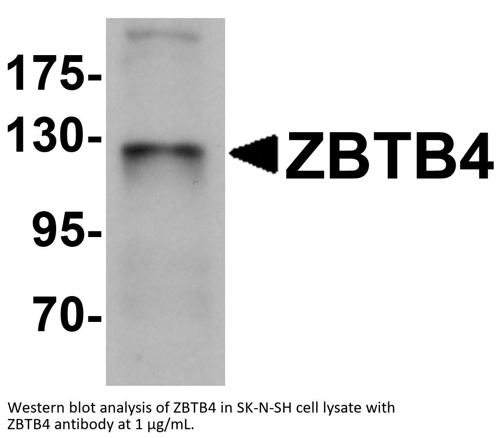 ZBTB4 Antibody: The ZBTB family of proteins is comprised of diverse zinc finger proteins that also contain a BTB (BR-C, ttk and bab) domain. Similar to Kaiso, a zinc-finger containing protein that can bind methylated CpGs, ZBTB4 can also bind methylated DNA and repress transcription. ZBTB4 has been shown to associate with the Sin3/histone deacetylase co-repressor and repress expression of P21CIP1 as part of a heterodimeric complex with Miz1. In cultured cells, depletion of ZBTB4 promotes cell cycle arrest in response to p53 activation and suppresses apoptosis through regulation of P21CIP1, suggesting that ZBTB4 is a critical determinant of the cellular response to p53 activation. HIPK2, a kinase that is involved in cellular proliferation and survival, phosphorylates and down-regulates ZBTB4 under normal cell growth conditions; this degradation increases with DNA damage.