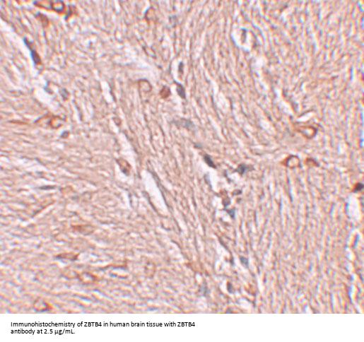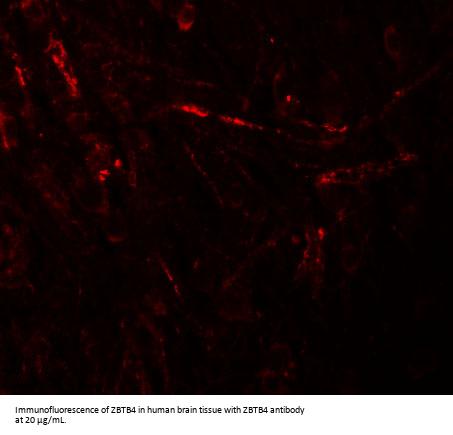ZBTB4 antibody can be used for detection of ZBTB4 by Western blot at 1 μ g/mL. Antibody can also be used for immunohistochemistry starting at 2.5 μ g/mL. For immunofluorescence start at 20 μ g/mL.