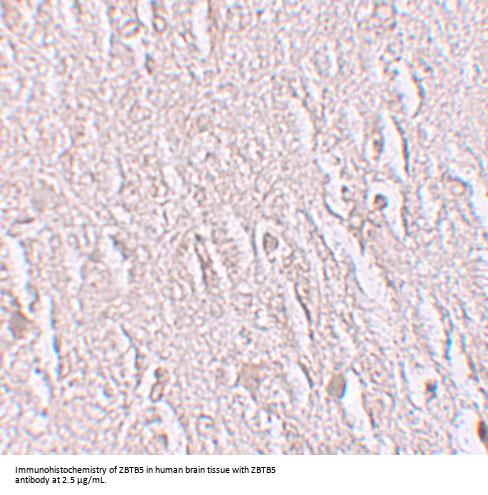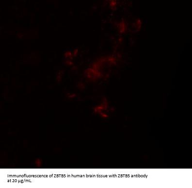 ZTBT5 antibody can be used for detection of ZTBT5 by Western blot at 1 - 2 μ g/mL. Antibody can also be used for immunohistochemistry starting at 2.5 μ g/mL. For immunofluorescence start at 20 μ g/mL.