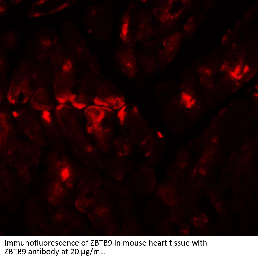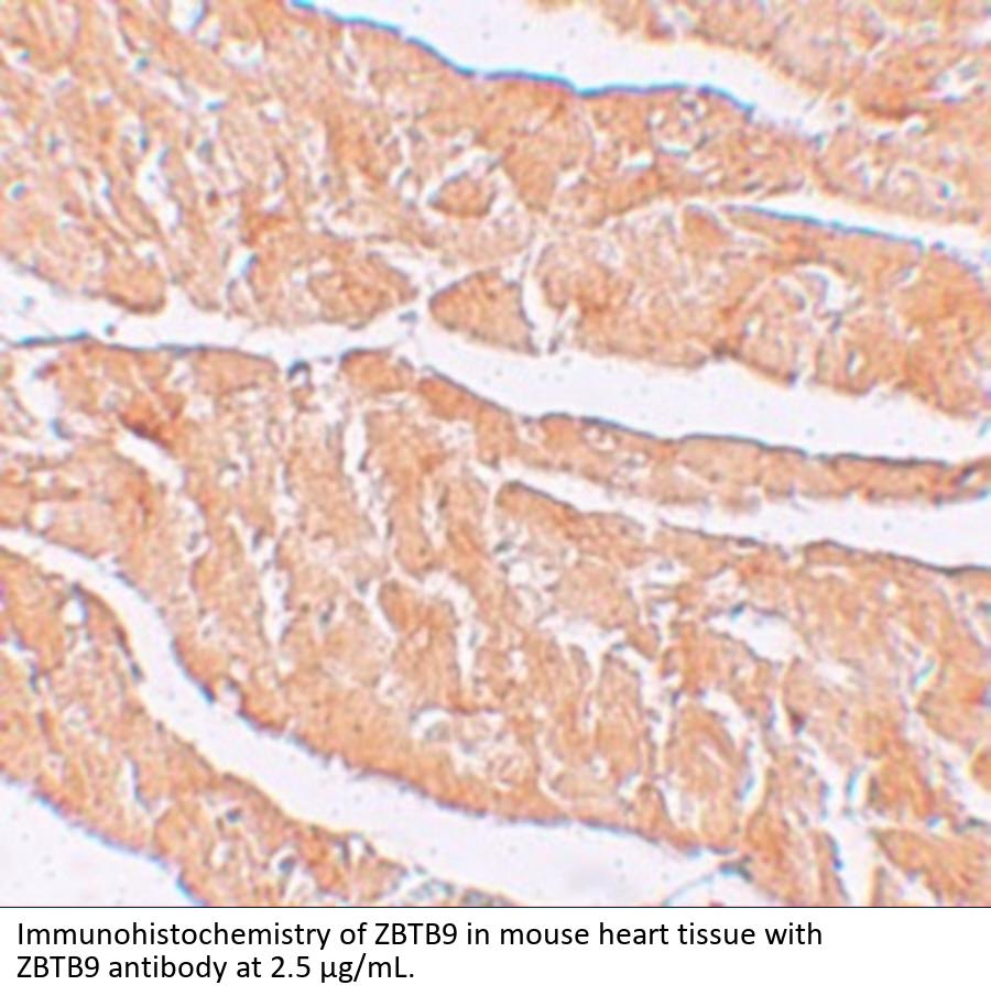 ZBTB9 antibody can be used for detection of ZBTB9 by Western blot at 1 μ g/mL. Antibody can also be used for immunohistochemistry starting at 2.5 μ g/mL. For immunofluorescence start at 5 μ g/mL.