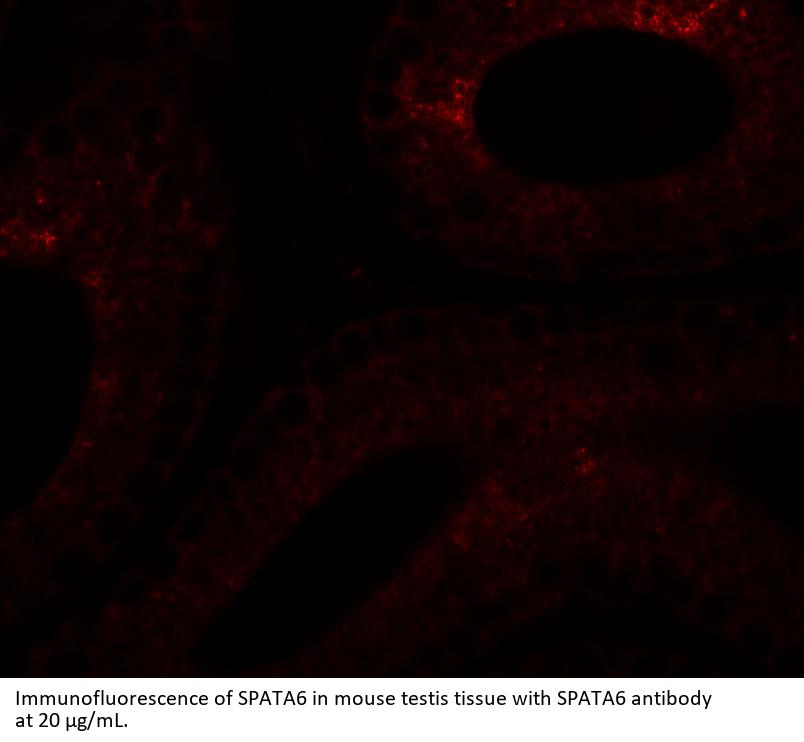 SPATA6 antibody can be used for detection of SPATA6 by Western blot at 1 μ g/mL. Antibody can also be used for immunohistochemistry starting at 2.5 μ g/mL. For immunofluorescence start at 20 μ g/mL.