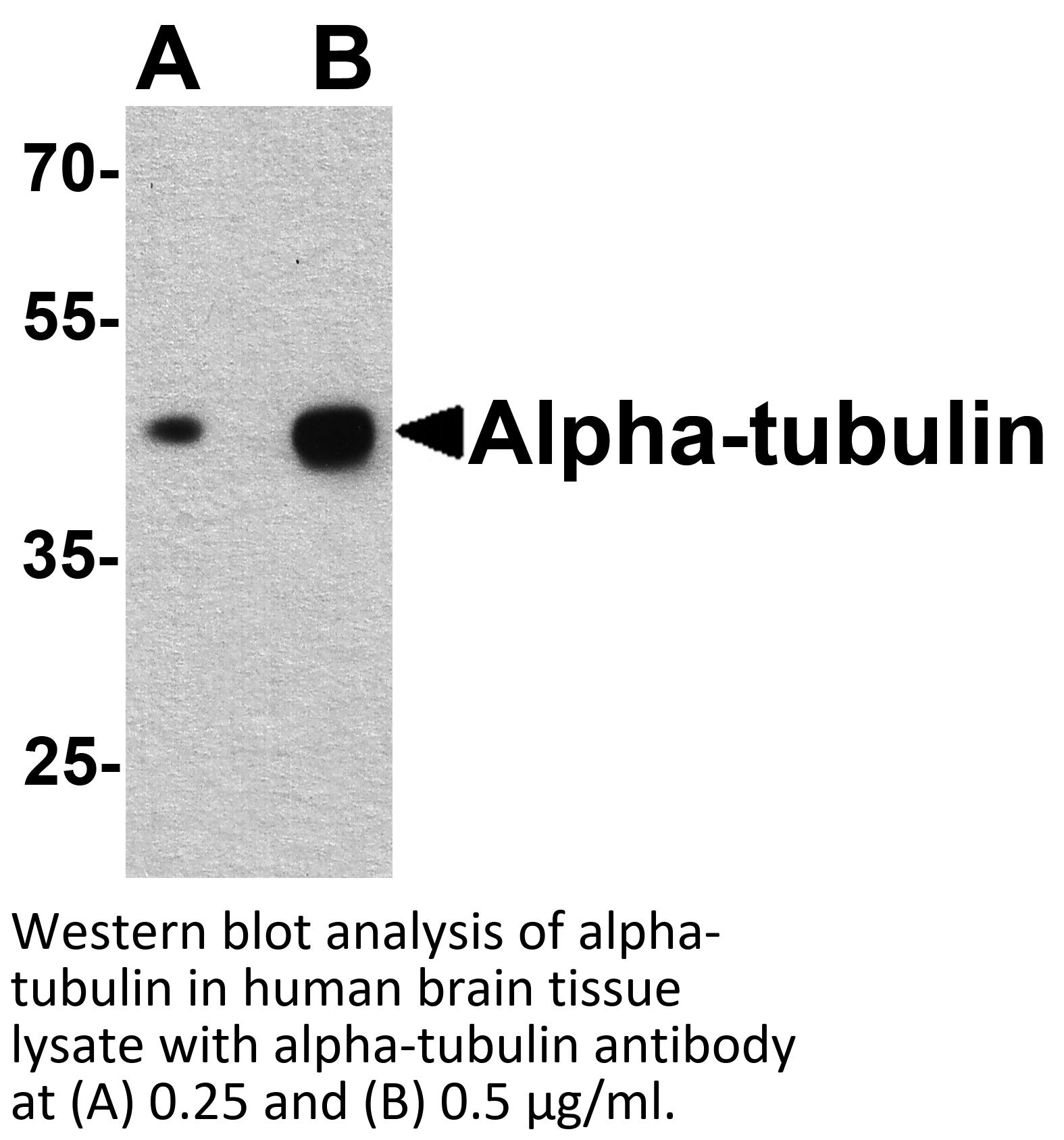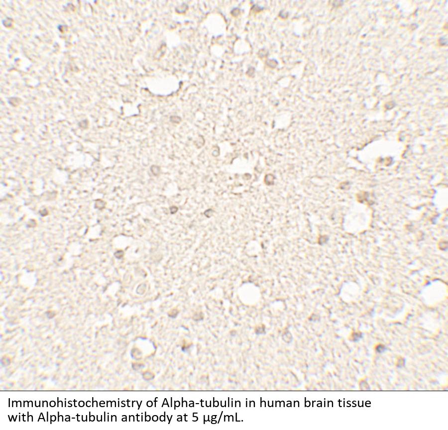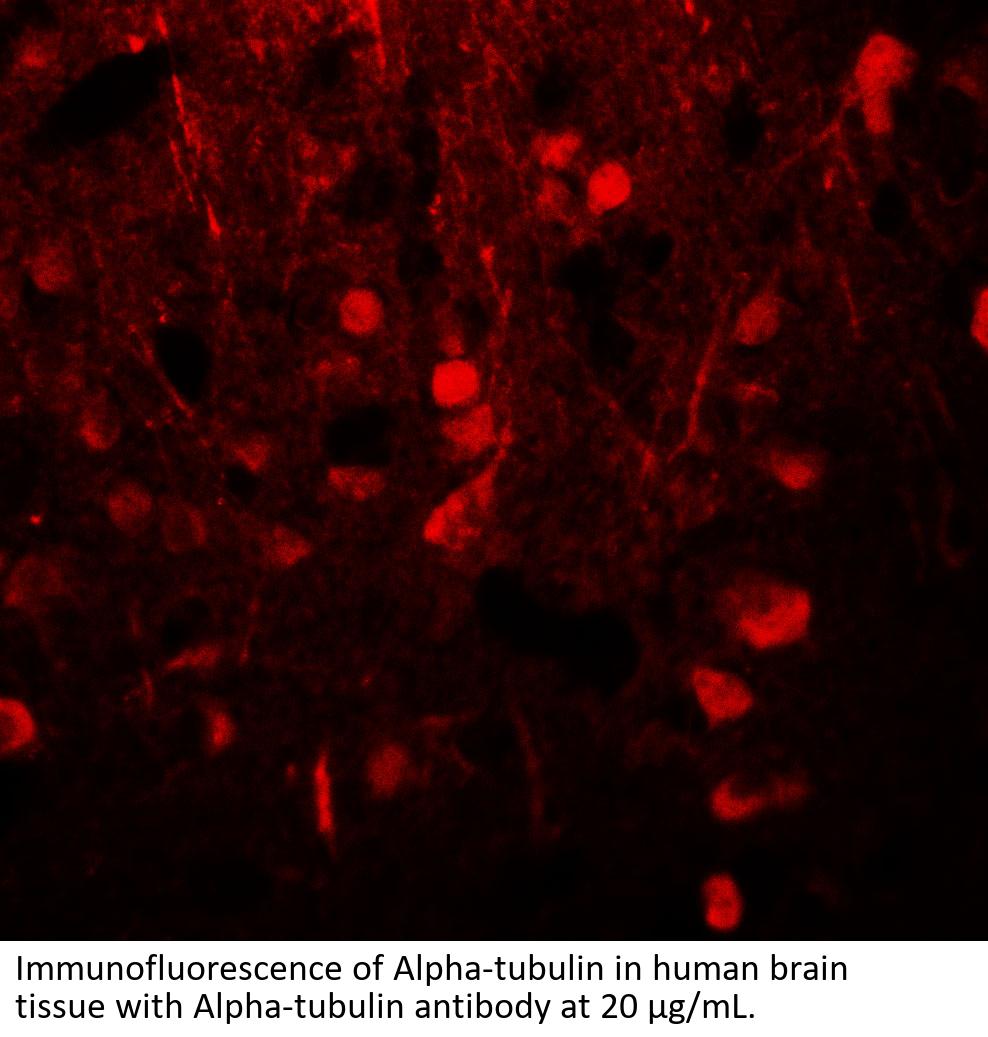 Alpha-tubulin antibody can be used for detection of alpha-tubulin by Western blot at 0.25 - 0.5 μ g/ml. Antibody can also be used for Immunohistochemistry starting at 5 μ g/mL. For immunofluorescence start at 20 μ g/mL.
