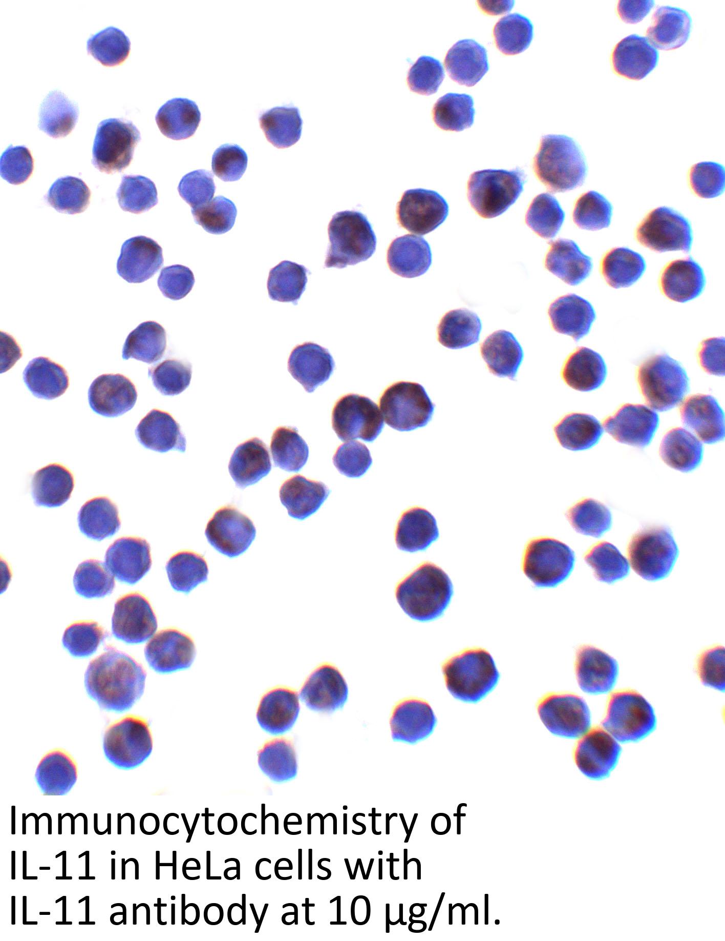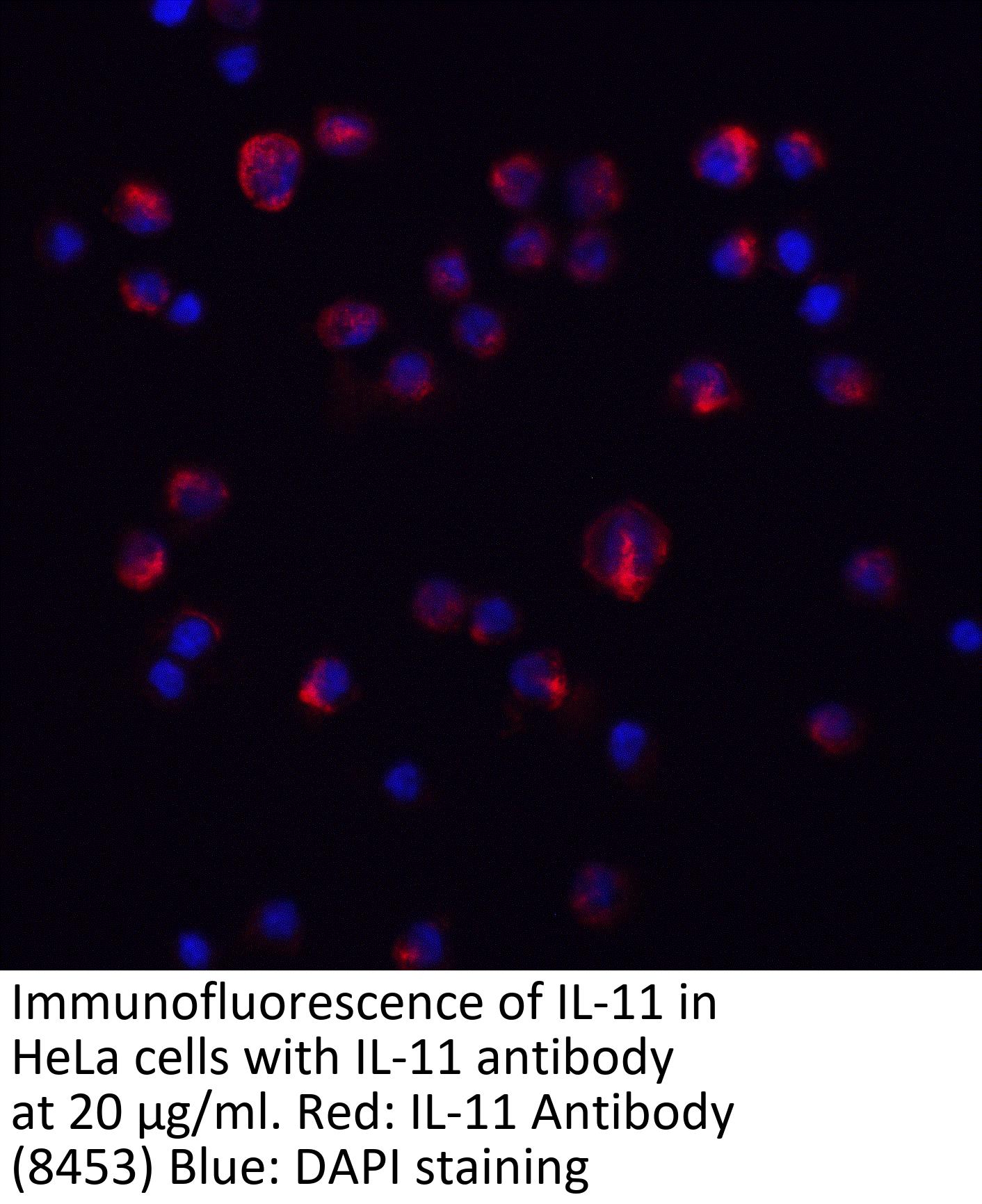 IL-11 antibody can be used for the detection of IL-11 by Western blot at 1 - 2 μ g/mL. Antibody can also be used for immunocytochemistry at 10 μ g/ml.