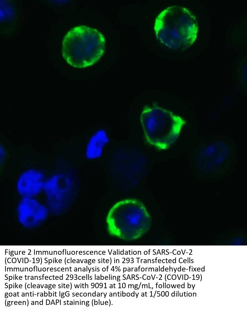 Anti-SARS-CoV-2 (COVID-19) Spike Antibody (cleavage site) (9091) was raised against a peptide corresponding to 12 amino acids near the center of SARS-CoV-2 (COVID-19) Spike glycoprotein.