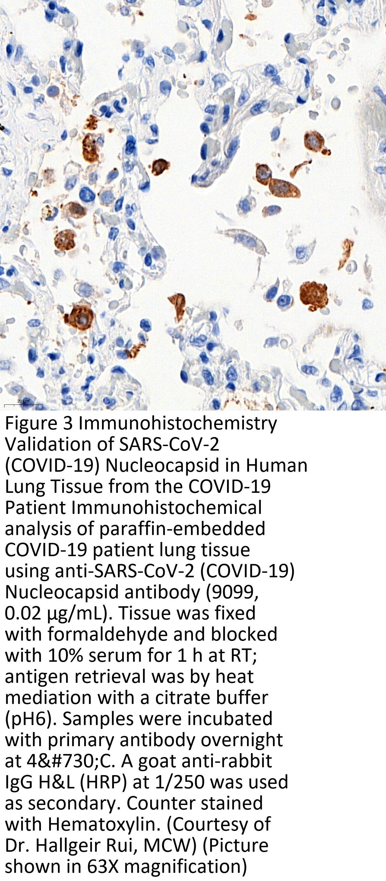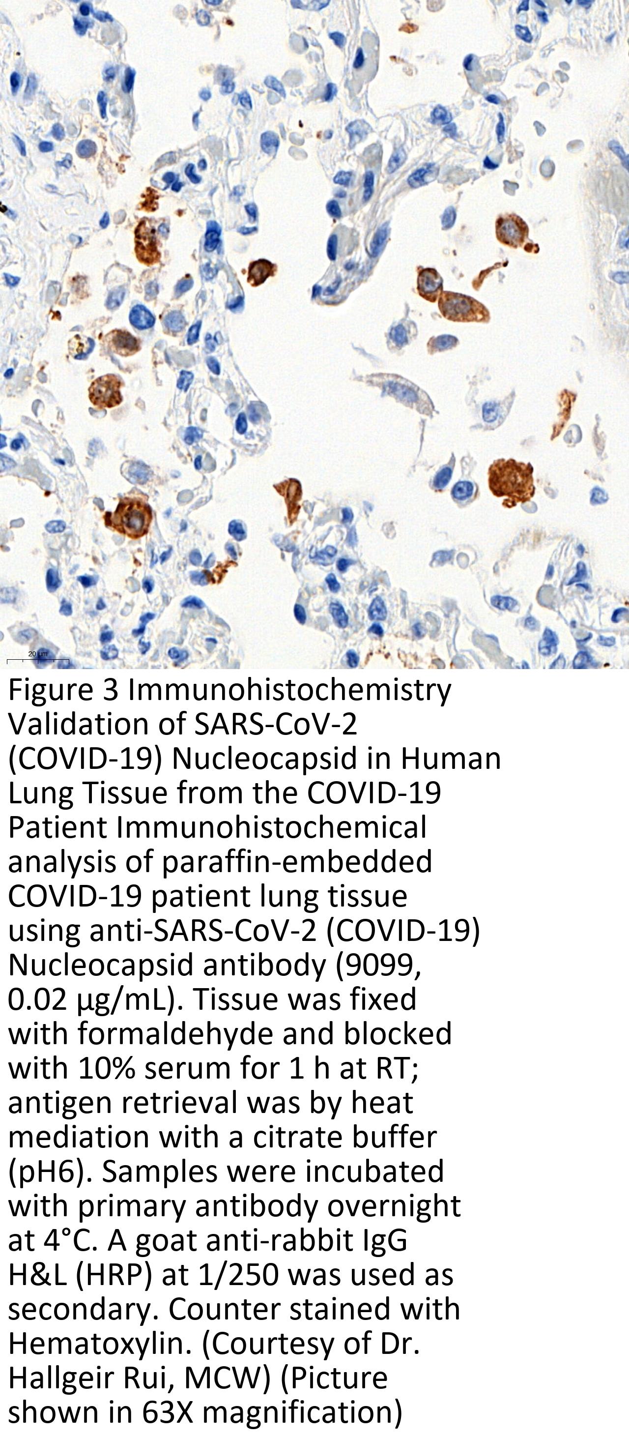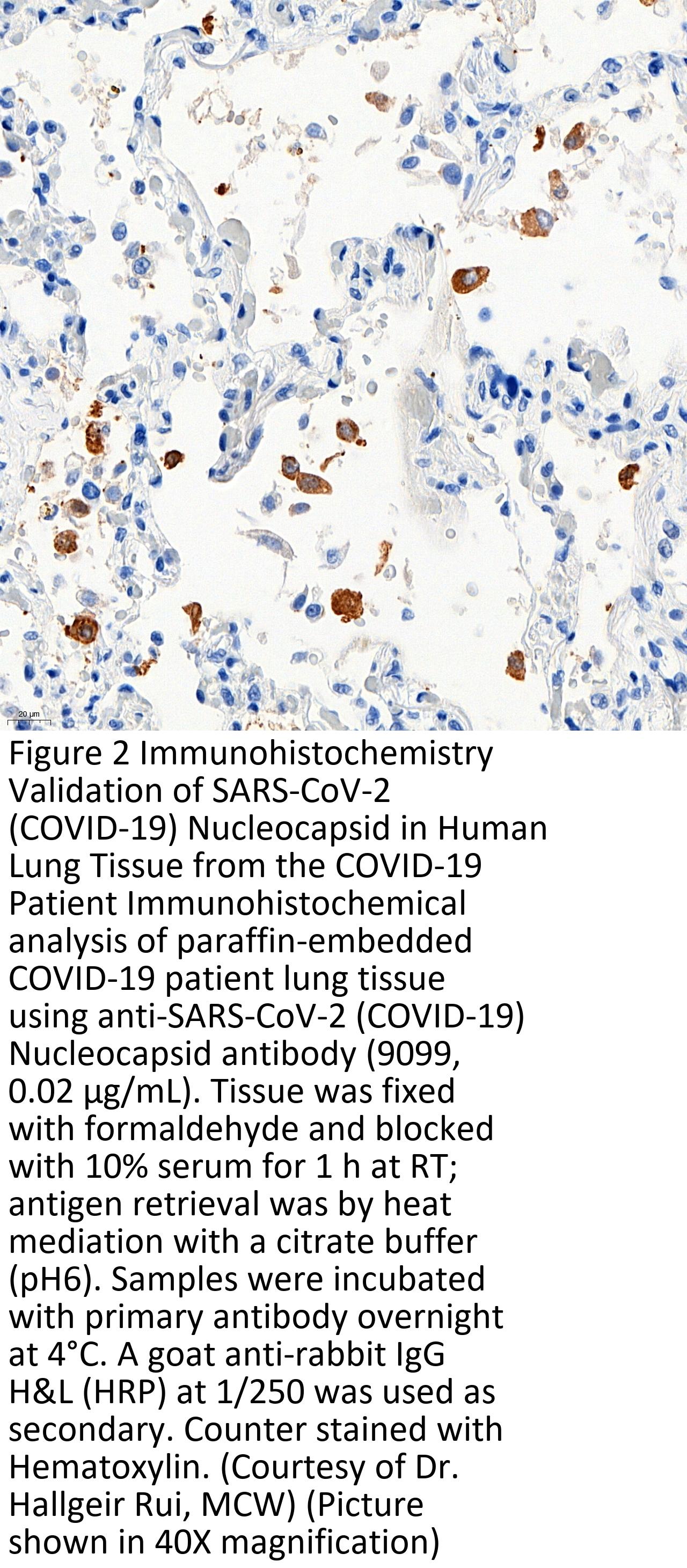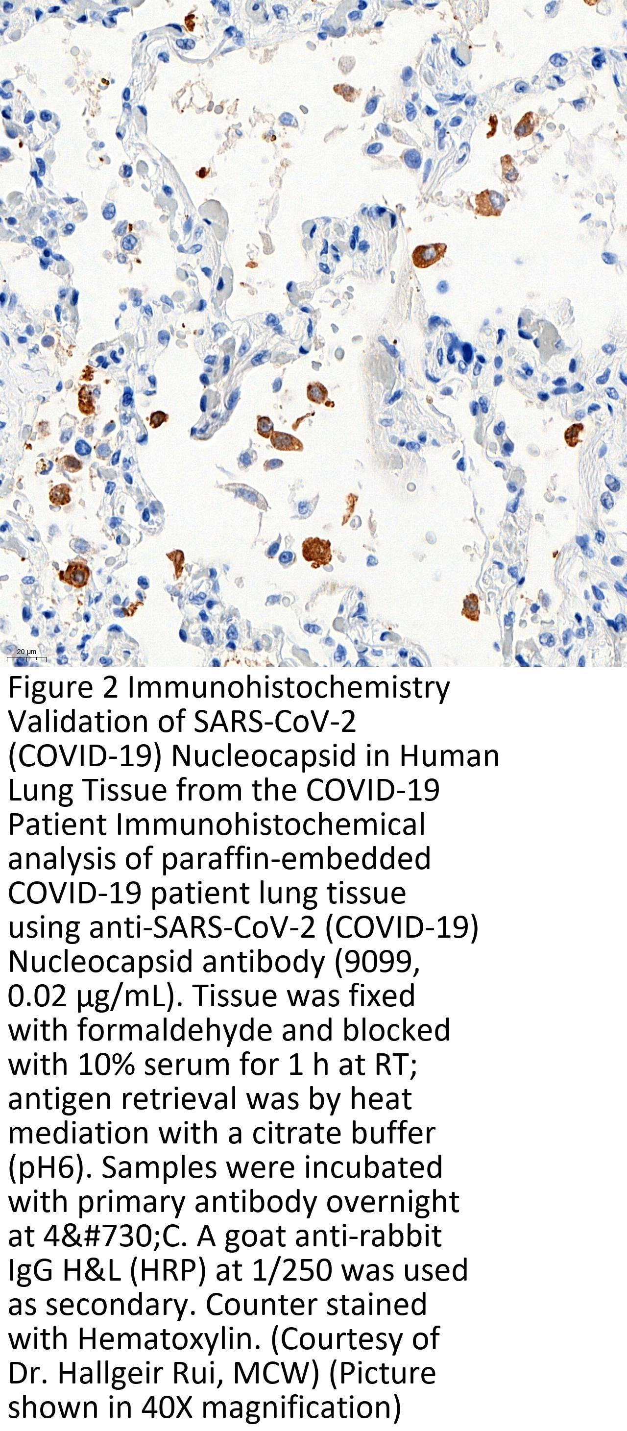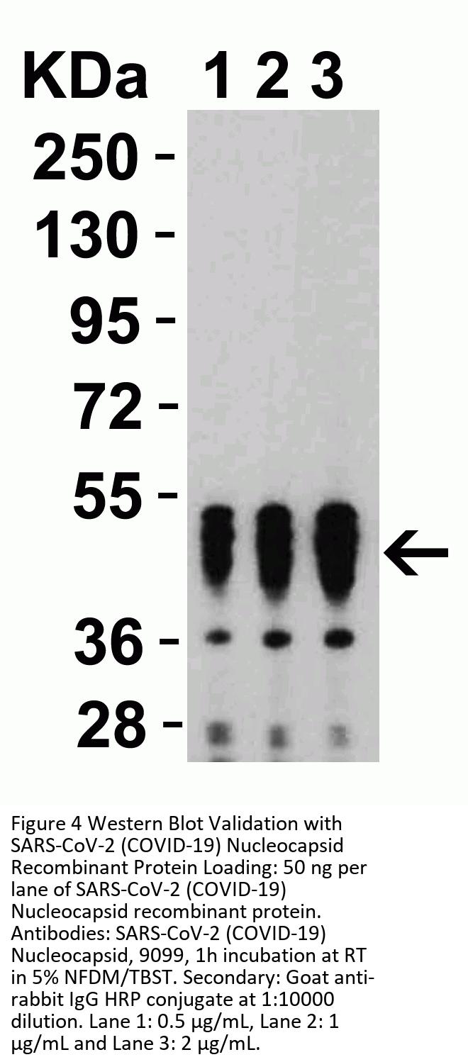 Anti-SARS-CoV-2 (COVID-19) Nucleocapsid antibody (9099) was raised against a peptide corresponding to 17 amino acids near the center of SARS-CoV-2 (COVID-19) Nucleocapsid protein.