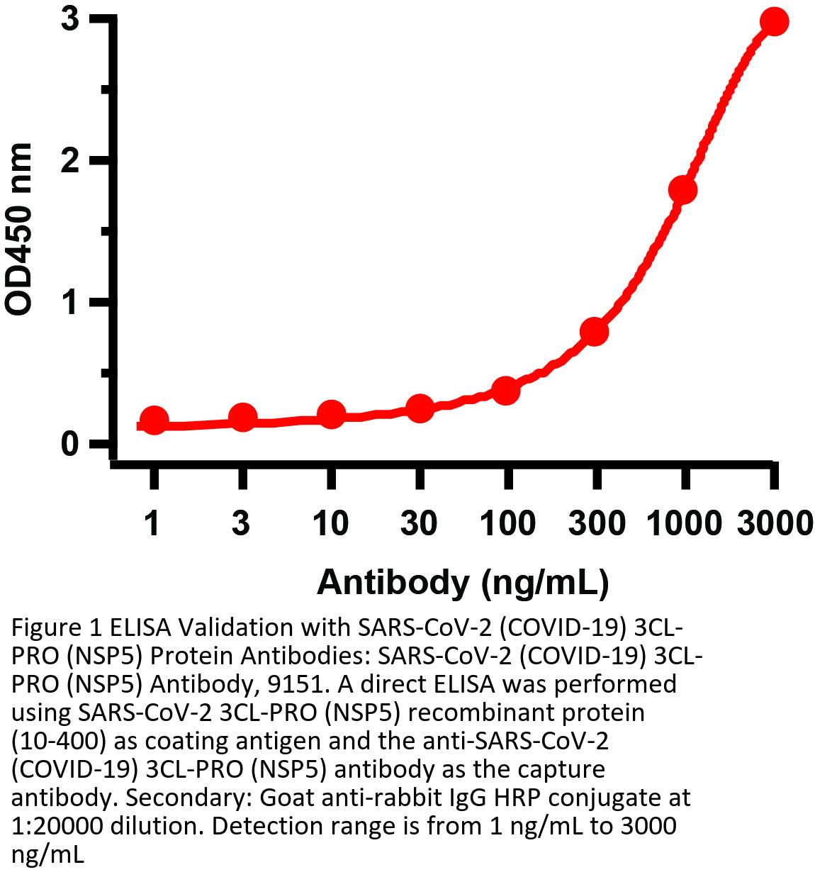 Antibody validated: SARS-CoV-2 (COVID-19) 3CL-PRO (NSP5) antibody can detect 2 ng of free peptide at 1 μ g/mL in ELISA.