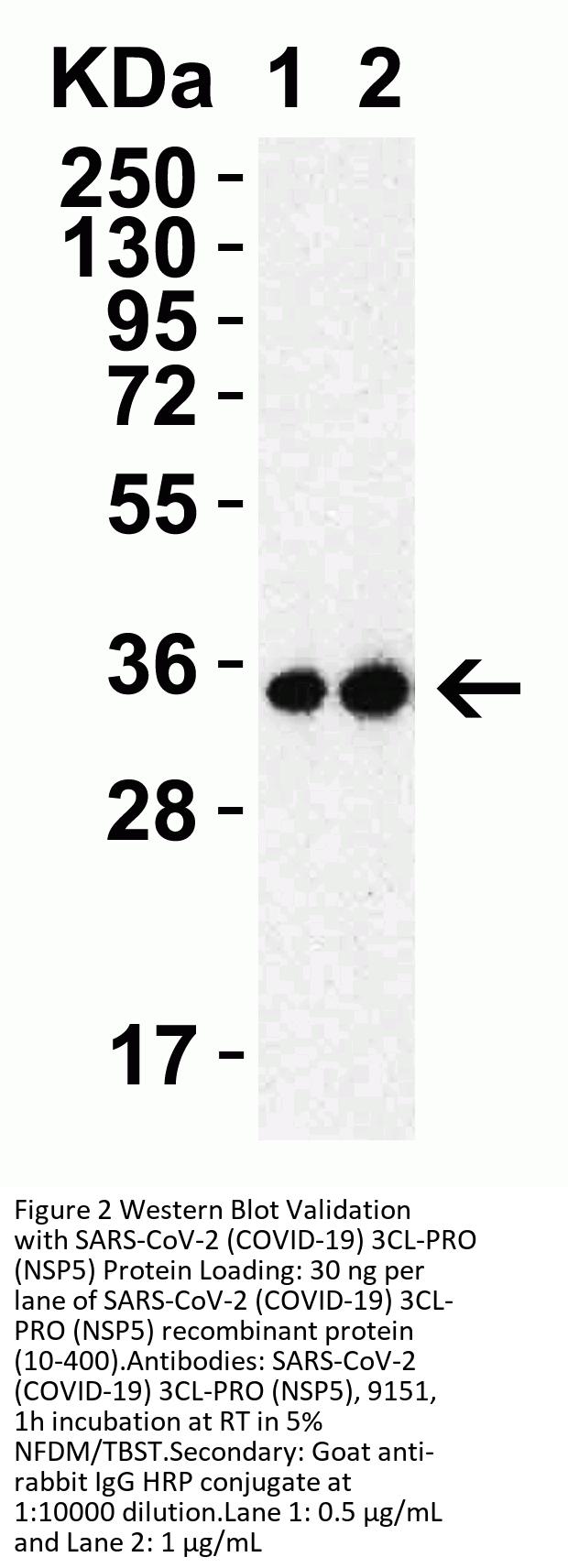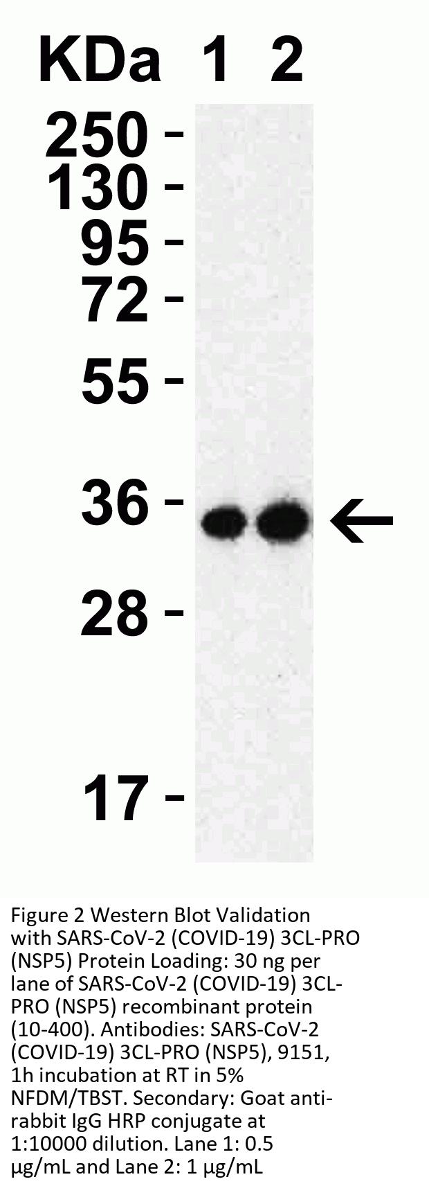 Anti-SARS-CoV-2 (COVID-19) 3CL-PRO (NSP5) antibody (9151) was raised against a peptide corresponding to 15 amino acids in the center of SARS-CoV-2 (COVID-19) 3CL-PRO (NSP5) protein.