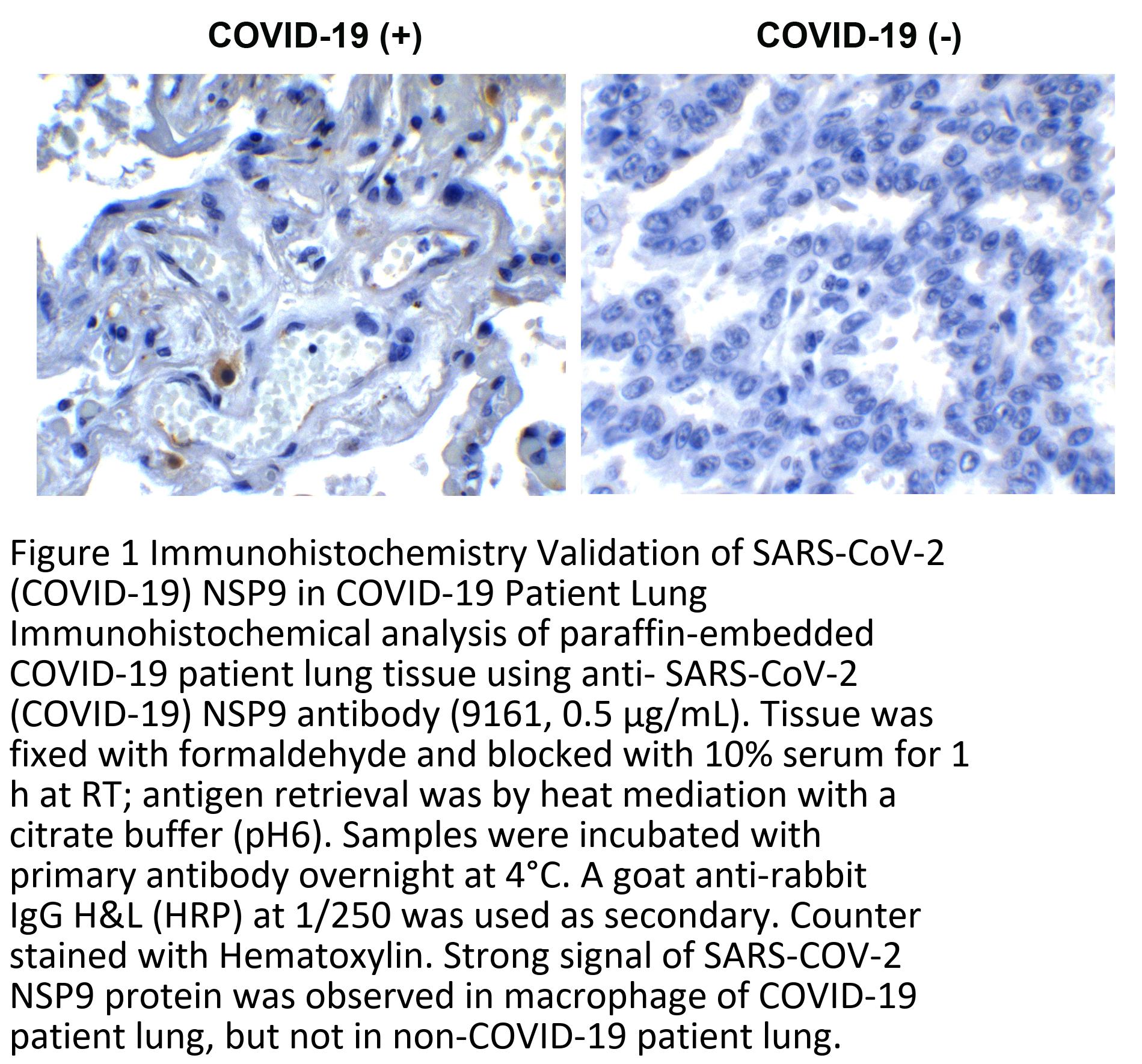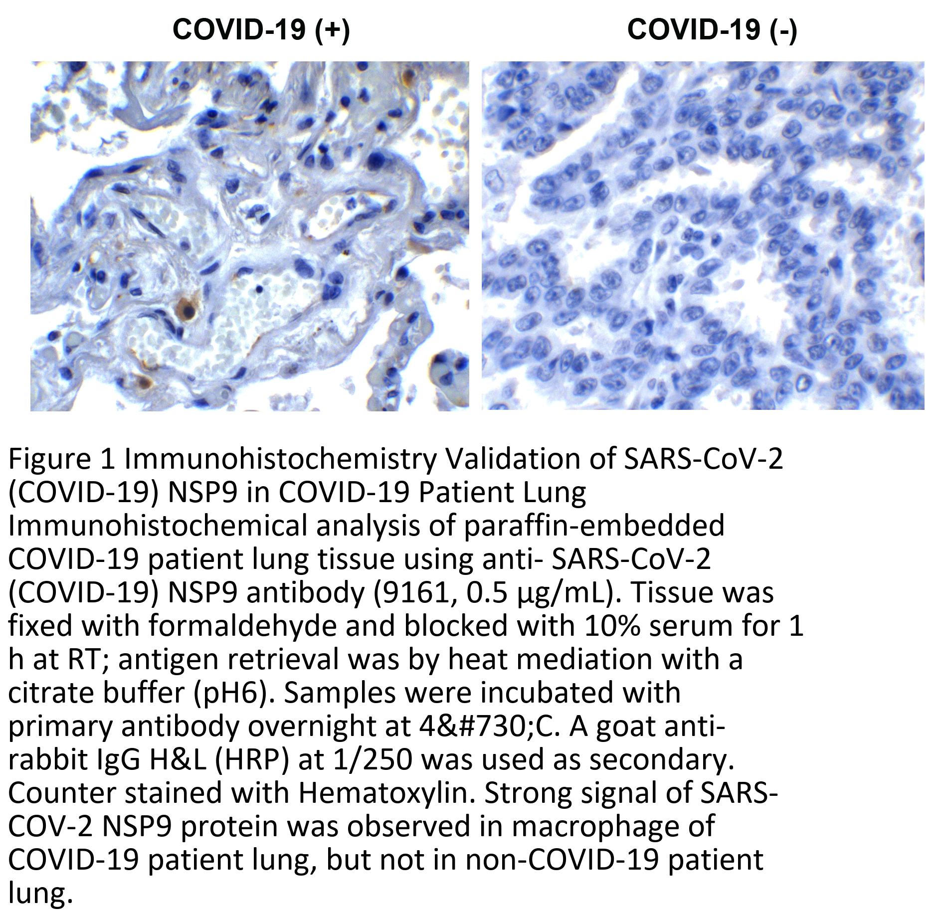 Anti-SARS-CoV-2 (COVID-19) NSP9 antibody (9161) was raised against a peptide corresponding to 13 amino acids near the center of SARS-CoV-2 (COVID-19) NSP9 protein.