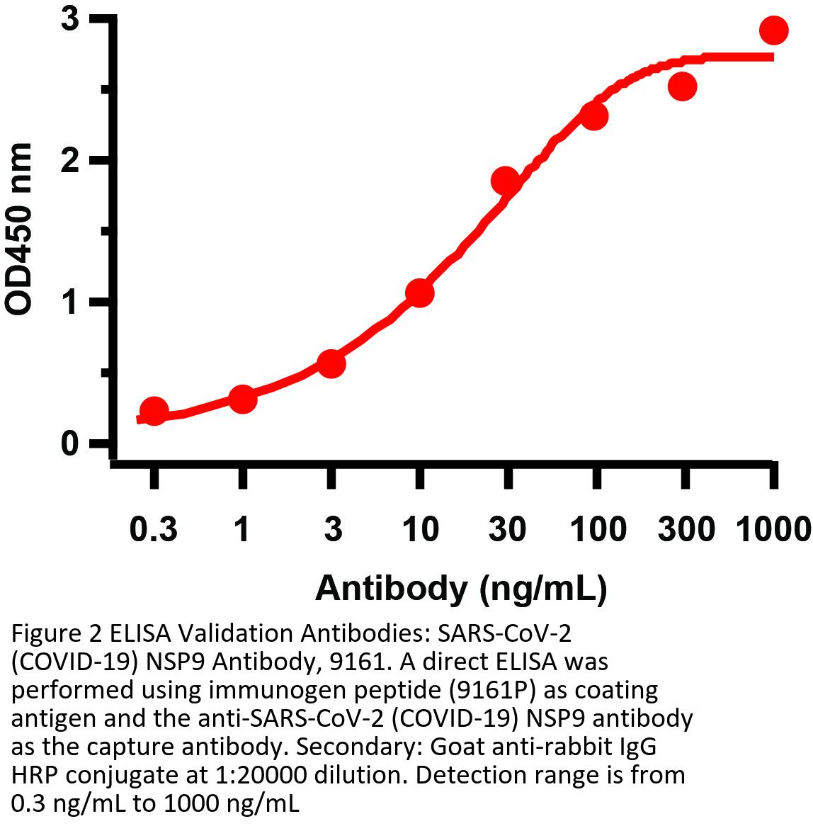 SARS-CoV-2 (COVID-19) NSP9 antibody can detect 2 ng of free peptide at 1 μg/mL in ELISA.