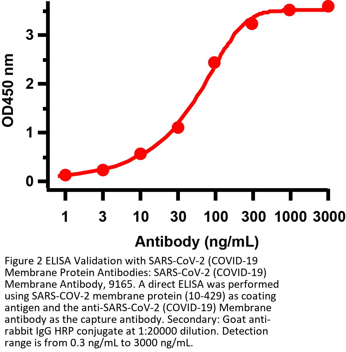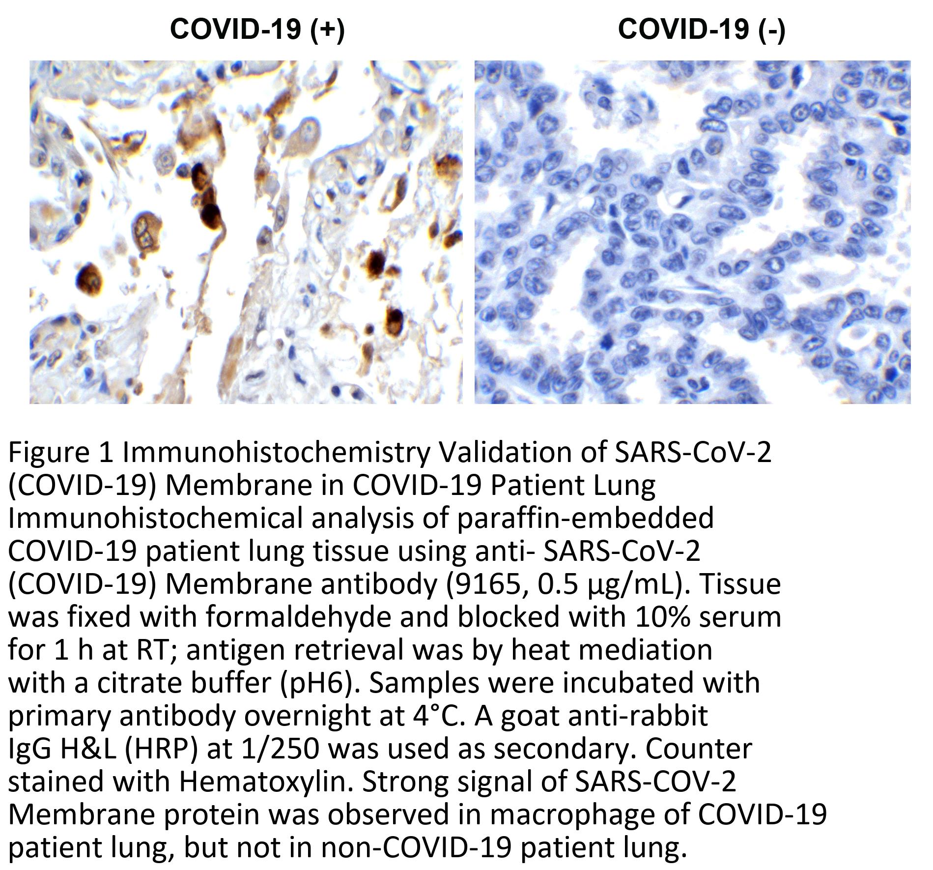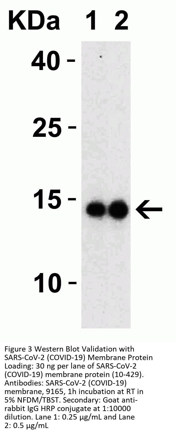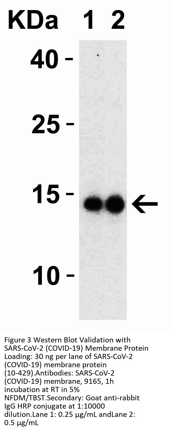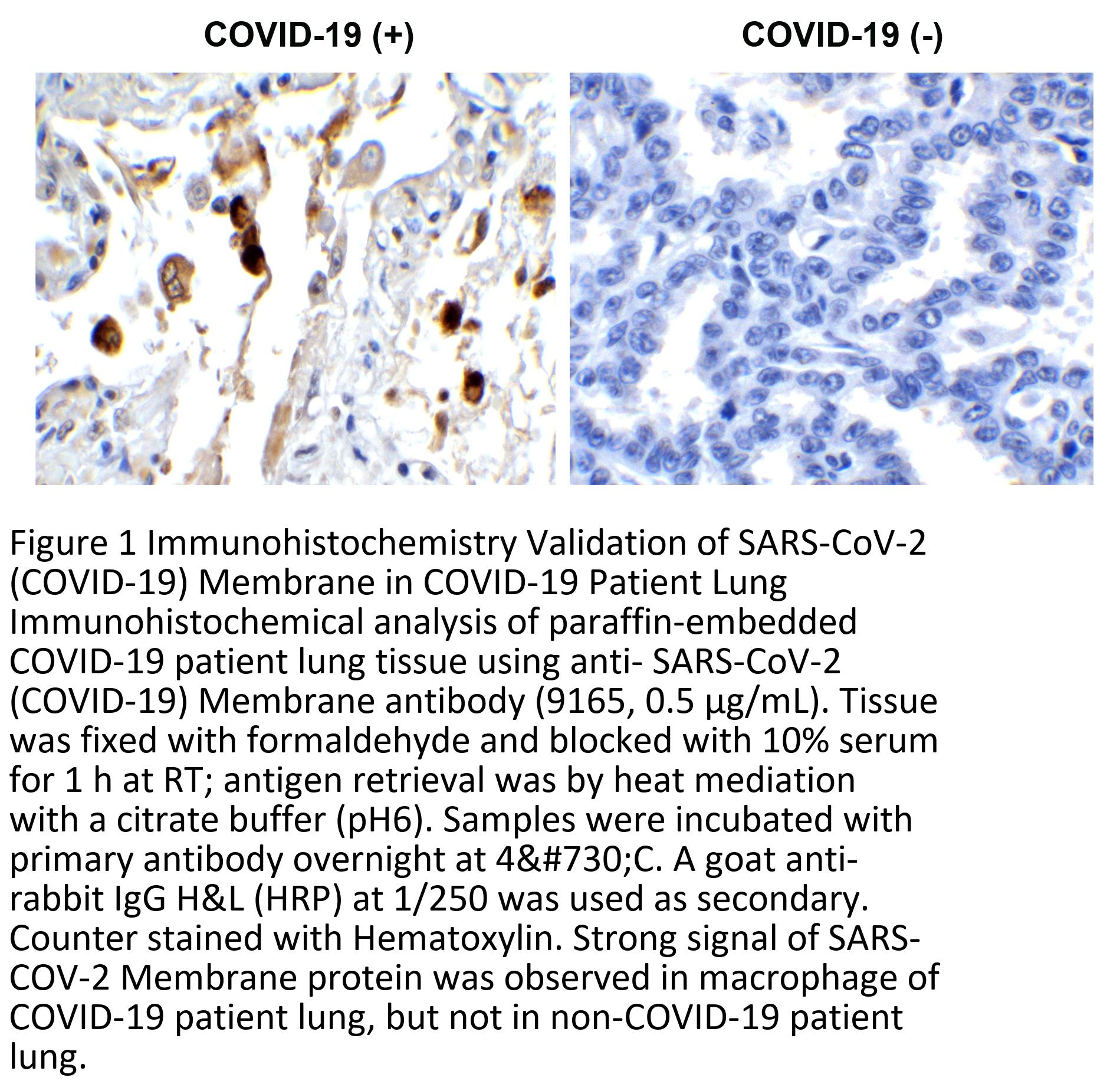 Anti-SARS-CoV-2 (COVID-19) Membrane antibody (9165) was raised against a peptide corresponding to 15 amino acids near the carboxyl terminus of SARS-CoV-2 (COVID-19) Membrane protein.