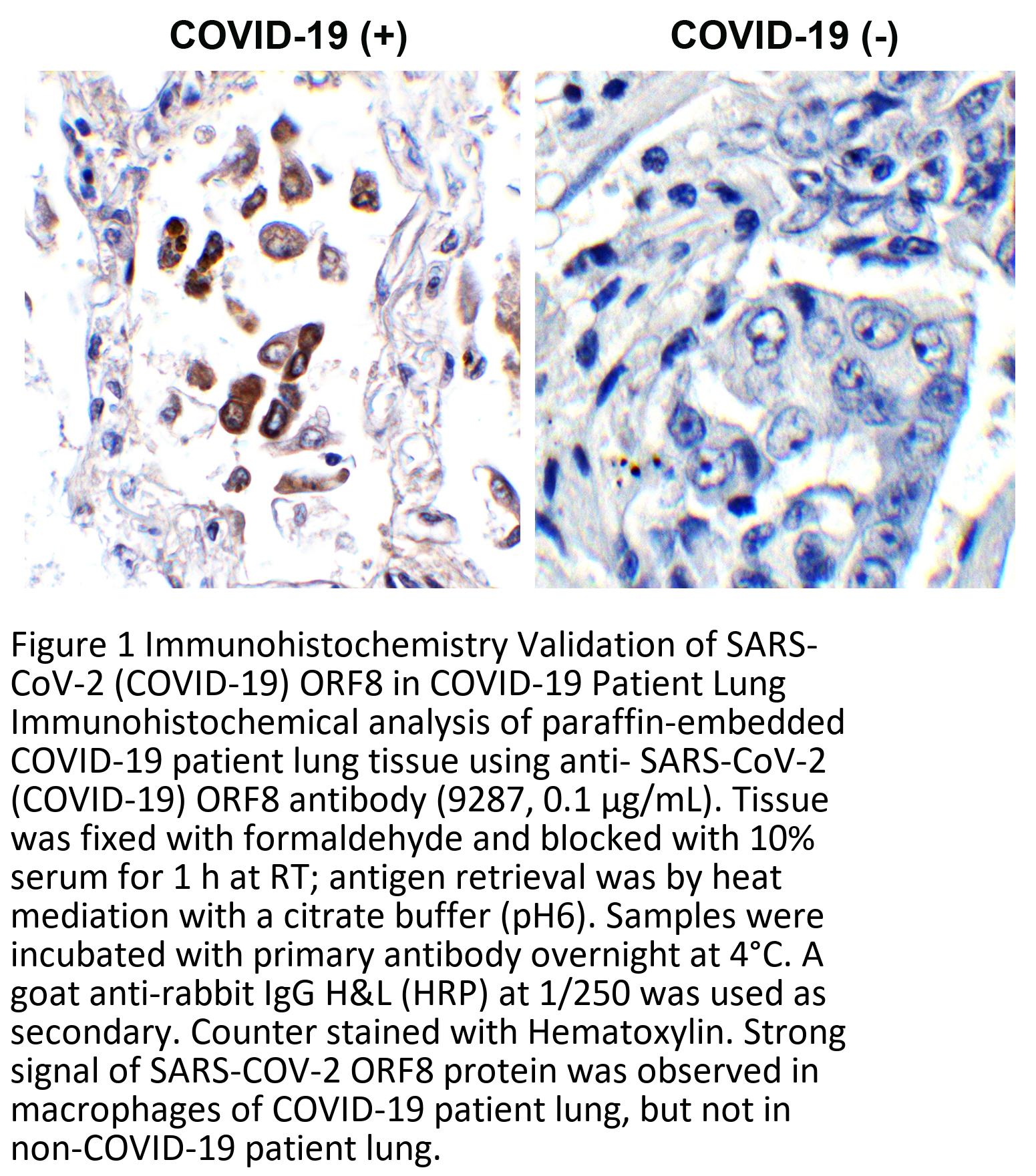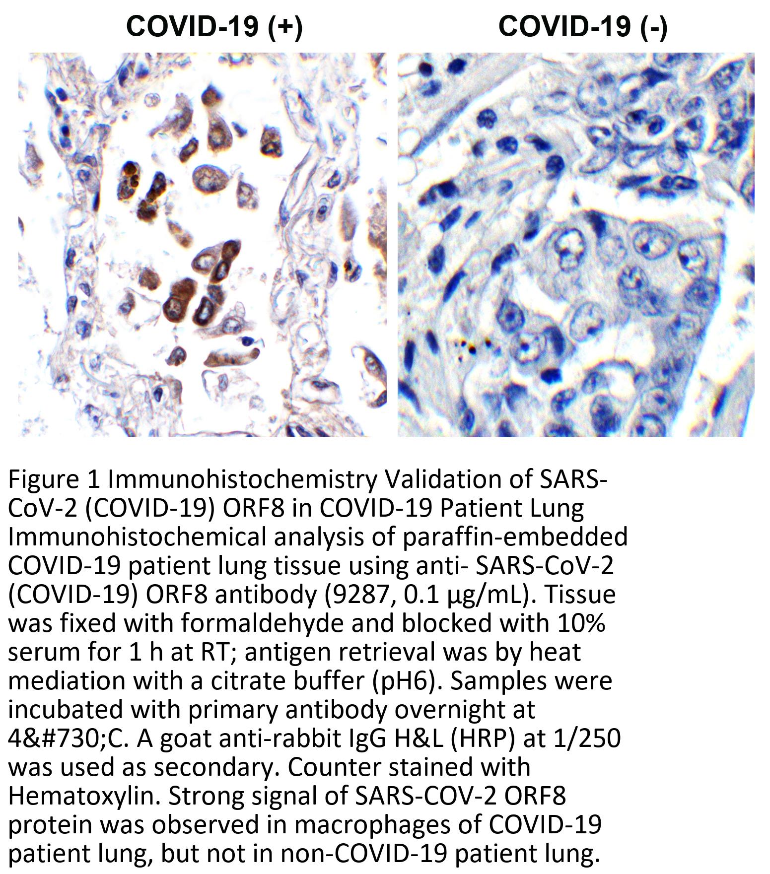 Anti-SARS-CoV-2 (COVID-19) ORF8 antibody (9287) was raised against a peptide corresponding to 14 amino acids near carboxyl terminus of SARS-CoV-2 (COVID-19) ORF8 protein.