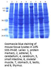The mouse tissue blot is designed for proteomics research in screening for antibody and protein expression. It carries 8 different mouse tissue lysates with 15 µg of total cellular protein in each lane. Proteins were separated in 4-20% SDS-PAGE gel and transferred onto nitrocellulose membrane.The mouse tissues included in the blot are adrenal, cerebellum, cerebrum, small intestine, skeletal muscle, stomach, testis, and thymus.