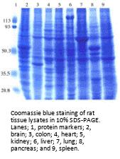 Lanes: 1, protein markers; 2, brain; 3, colon; 4, heart; 5, kidney; 6, liver; 7, lung; 8, pancreas; and 9, spleen.