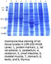 Lanes: 1, protein markers; 2, rat rat adrenal; 3, cerebellum; 4, cerebrum; 5, small intestine; 6, skeletal muscle; 7, stomach; 8, testis; and 9, thymus