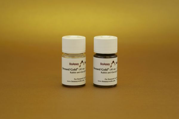 Dressed Gold Rabbit anti-Goat IgG (H+L) conjugates are produced using Rabbit anti-Goat IgG (H+L) polyclonal antibodies and BioAssay Works proprietary 40 nm Naked Gold sols. The conjugates are highly reactive and ideal for use in lateral flow assays where high sensitivity is required. Dressed Gold Rabbit anti-Goat IgG (H+L) conjugates are available either in our standard 15 O.D./mL concentration or in our highly-concentrated 50 O.D./mL concentration. Several volumes are available to meet your needs.