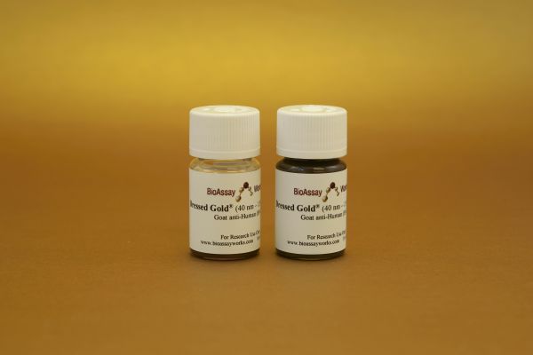 Dressed Gold Goat anti-Human IgG (H+L) conjugates are produced using Goat anti-Human IgG (H+L) polyclonal antibodies and BioAssay Works proprietary 40 nm Naked Gold sols. The conjugates are highly reactive and ideal for use in lateral flow assays where high sensitivity is required. Dressed Gold Goat anti-Human IgG (H+L) conjugates are available either in our standard 15 O.D./mL concentration or in our highly-concentrated 50 O.D./mL concentration. Several volumes are available to meet your needs.