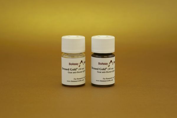 Dressed Gold Goat anti-Human IgM (u) conjugates are produced using Goat anti-Human IgM (u) polyclonal antibodies and BioAssay Works proprietary 40 nm Naked Gold sols. The conjugates are highly reactive and ideal for use in lateral flow assays where high sensitivity is required. Dressed Gold Goat anti-Human IgM (u) conjugates are available either in our standard 15 O.D./mL concentration or in our highly-concentrated 50 O.D./mL concentration. Several volumes are available to meet your needs.