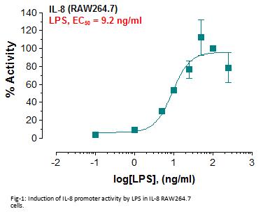 Cells should be grown at 37°C with 5% CO2 using DMEM medium supplemented with 10% FBS and 1% Pen/Strep, plus 3 µg/ml of Puromycin (Note: Puromycin can be omitted during the reporter cell assays). It is recommended to quickly thaw the frozen cells upon receipt or from liquid nitrogen in a 37°C water-bath, transfer to a tube containing 10 ml of growth medium without Puromycin, spin down cells, resuspend cells in pre-warmed growth medium without Puromycin, transfer resuspended cells to T25 flask and culture in 37°C-CO2 incubator.Leave the T25 flask in the incubator for 1~2 days without disturbing or changing the medium until cells completely recover viability and become adherent. Once cells are over 90% adherent, remove growth medium and passage the cells through trypsinization and centrifugation. At first passage, switch to growth medium containing Puromycin. Cells should be split before they reach complete confluence. Note: RAW264.7 cells may not be detached well by trypsinization only. So you may need to use a cell scraper to harvest the trypsinized cells.To passage the cells, detach cells from culture vessel with Trypsin/EDTA, add complete growth medium and transfer to a tube, spin down cells, resuspend cells and seed appropriate aliquots of cells suspension into new culture vessels. Subcultivation ration = 1:10 to 1:20 weekly. To achieve satisfactory results, cells should not be passaged over 16 times.Functional validation:A. Response of IL-8 RAW264.7 cells to lipopolysaccharide (LPS)1. Harvest IL-8 RAW264.7 cells and seed cells into a white solid-bottom 96-well microplate in 100 µl of growth medium at 8.5 x 104 cells/well.2. Incubate cells at 37°C in a CO2 incubator for overnight.3. The next day, stimulate cells with different concentrations of LPS.4. Incubate at 37°C in a CO2 incubator for 6-16 hours.5. Add 50 µl of luciferase assay reagent per well.6. Incubate at room temperature for 1-5 minutes and measure luminescence using a microplate luminometer.