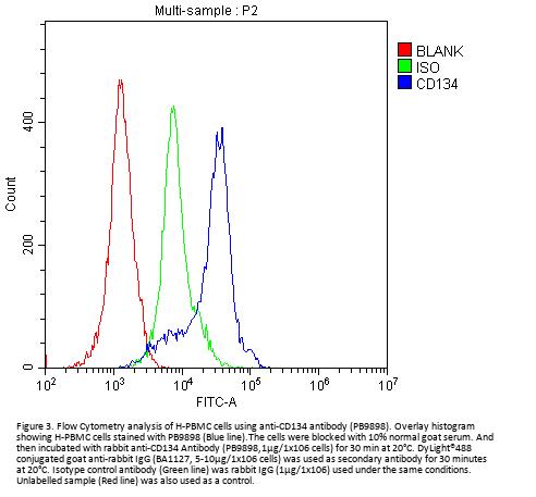 Boster Bio Anti-CD134/OX40/TNFRSF4 Antibody Picoband® catalog # PB9898. Tested in Flow Cytometry, IHC, ICC, WB applications. This antibody reacts with Human. The brand Picoband indicates this is a premium antibody that guarantees superior quality, high affinity, and strong signals with minimal background in Western blot applications. Only our best-performing antibodies are designated as Picoband, ensuring unmatched performance.
