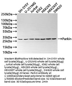 Alias AR JP antibody,E3 ubiquitin ligase antibody,E3 ubiquitin protein ligase parkin antibody,E3 ubiquitin-protein ligase parkin antibody,FRA6E antibody,LPRS 2 antibody,LPRS2 antibody,PARK 2 antibody,Park2 antibody,Parkin 2 antibody,Parkinson disease (autosomal recessive juvenile) 2 antibody,Parkinson disease (autosomal recessive,juvenile) 2,parkin antibody,Parkinson disease protein 2 antibody,Parkinson juvenile disease protein 2 antibody,Parkinson protein 2 E3 ubiquitin protein ligase antibody,Parkinson protein 2,E3 ubiquitin protein ligase (parkin) antibody,PDJ antibody,PRKN 2 antibody,PRKN antibody,PRKN2 antibody,PRKN2_HUMAN antibody,Ubiquitin E3 ligase PRKN antibody