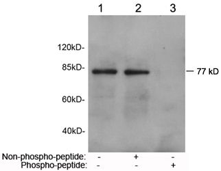 The antibody is purified from rabbit antiserum by affinity chromatography using epitope-specific phosphopeptide and cross-adsorbed with the corresponding non-phosphopeptide.