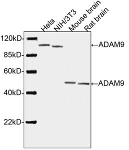 Specificity GenScript Rabbit Anti-ADAM9 Polyclonal Antibody detects endogenous levels of human mouse and rat ADAM9.