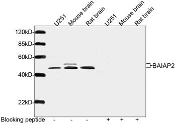 BAIAP2 is a target of p53 which functions as an insulin receptor tyrosine kinase substrate and may play a role for insulin in the central nervous system. BAIAP2 protein can serve as a brain-specific angiogenesis inhibitor (BAI1)-binding protein and its interaction may be involved in neuronal growth-cone guidance. It associates with a downstream effector of Rho small G proteins, which is associated with the formation of stress fibers and cytokinesis.It interacts with the dentatorubral-pallidoluysian atrophy gene, which is associated with an autosomal dominant neurodegenerative disease.
