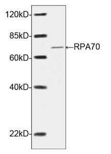 RPA70 is a component of a heterotrimeric complex, composed of 70, 32/30 and 14 kD subunits, collectively known as RPA. RPA is a single stranded DNA binding protein, whose DNA binding activity is believed to reside entirely in the 70 kD subunit. The complex plays an essential role in several cellular processes in DNA metabolism including replication, recombination and DNA repair. RPA binds and subsequently stabilizes single-stranded DNA intermediates and thus prevents complementary DNA from reannealing. GenScript RPA70 Antibody, pAb, Rabbit, is developed in rabbit using a KLH-coupled synthetic peptide from N-terminal of human RPA70 protein (Swiss Prot: P27694).