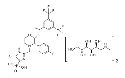Smiles O=C1N=C(CN2[C@@H](C3=CC=C(F)C=C3)[C@@H](O[C@H](C)C4=CC(C(F)(F)F)=CC(C(F)(F)F)=C4)OCC2)NN1P(O)(O)=O.OC[C@@H](O)[C@@H](O)[C@H](O)[C@@H](O)CNC.OC[C@@H](O)[C@@H](O)[C@H](O)[C@@H](O)CNC