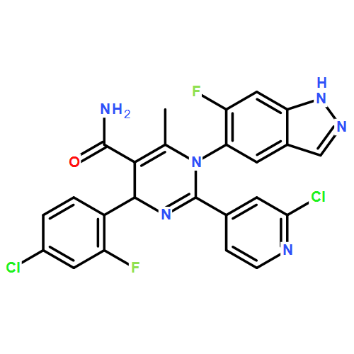 Smiles CC1=C(C(N=C(N1)C2=CC(=NC=C2)Cl)C3=C(C=C(C=C3)Cl)F)C(=O)NC4=C(C=C5C(=C4)C=NN5)F