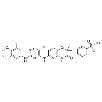 Smiles O1C(C)(C)C(=O)NC2=NC(NC3C(F)=CN=C(NC4=CC(OC)=C(OC)C(OC)=C4)N=3)=CC=C12.C(S(O)(=O)=O)1=CC=CC=C1