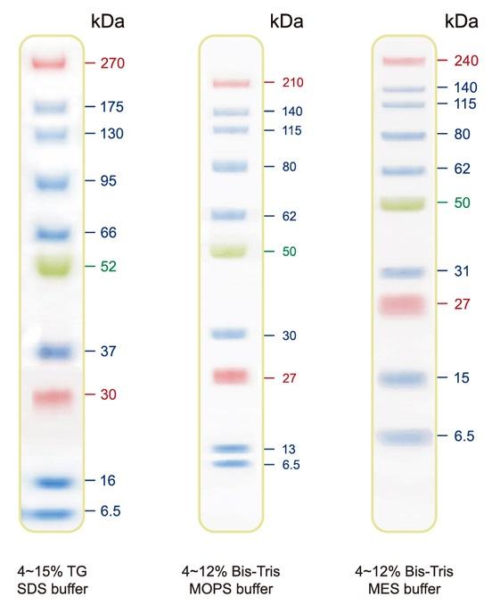 6.5-270 kDa Protein Marker contains 10 prestained proteins ranging from 6.5 to 270 kDa. The 30 kDa and 270 kDa proteins are covalently coupled to an orange dye and the 52 kDa protein is covalently coupled to a green dye. The other 7 proteins are covalently coupled to a blue dye. Coloured protein bands can be seen in SDS-PAGE after transferring to a PDVF, nylon or nitrocellulose membrane.