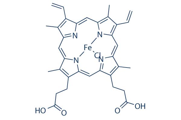 Hemin (protohemin) is an iron-containing porphyrin used in the management of porphyria attacks, particularly in acute intermittent porphyria.Hemin is an Heme oxygenase (HO)-1 inducer.This product has poor solubility, animal experiments are available, cell experiments please choose carefully!