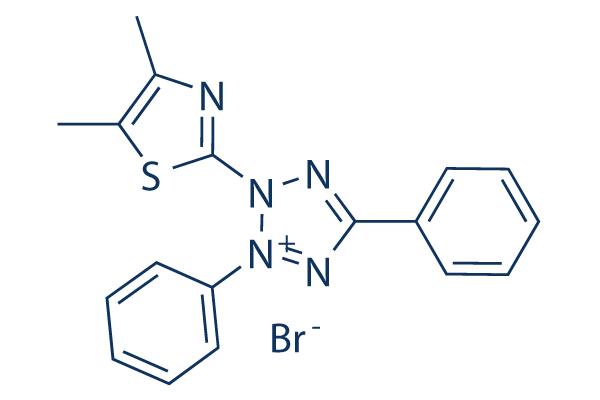 Thiazolyl Blue (MTT, Tetrazolium bromide, Methylthiazolyldiphenyl-tetrazolium bromide, Methylthialazole Tetrazolium) is a cell-permeable and positively charged colorimetric agent that is widely used to detect reductive metabolism in cells and to measure cell proliferation, cytotoxicity, and apoptosis. Thiazolyl Blue (MTT) is reduced from yellow color to purple formazan in living cells.