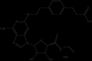 Description: CGS 21680 HCl (CGS21680; CGS-21680), the hydrochloride salt of CGS 21680, is a potent and specific agonist of adenosine A2 receptors with potential antideppressant activity. It activates adenosine A2 receptors with an IC50 of 22 nM, and exhibits 140-fold selectivity over A1 receptors.