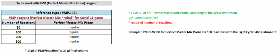 To be used with PMP (Perfect Master Mix Probe) reagent * Z : W, R, LR or F Perfect Master Mix Probe, according to the qPCR instrument (cf Compatibility file) * required number of reactions Example : PMP1-W100 for Perfect Master Mix Probe for 100 reactions with the Light Cycler 480 instrument