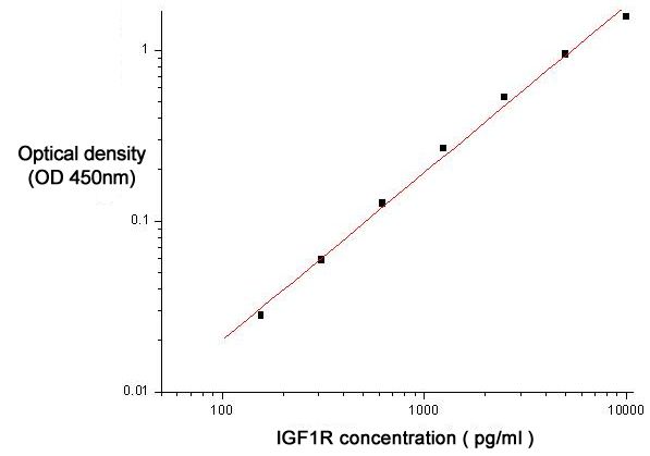 Each vial contains 140 ng of recombinant IGF1R. Reconstitute with 1 mL detection antibody dilution buffer. After reconstitution, store at -20C to -80C in a manual defrost freezer. A seven-point standard curve usi ng 2-fold serial dilutions in sample dilution buffer, and a high standard of 10 ng/mL is recommended.