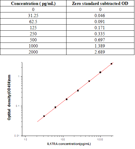 Each vial contains 120 ng of recombinant IL17RA. Reconstitute with 1 mL detection antibody dilution buffer. After reconstitution, store at -20C to -80C in a manual defrost freezer. A seven-point standard curve usi ng 2-fold serial dilutions in sample dilution buffer, and a high standard of 2000 pg/mL is recommended