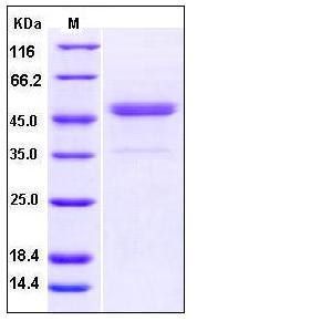 The recombinant human CD112 comprises 335 amino acids and has a calculated molecular mass of 36.2 kDa. As a result of glycosylation, the recombinant protein migrates as an approximately 48 kDa protein in SDS-PAGE under reducing conditions.