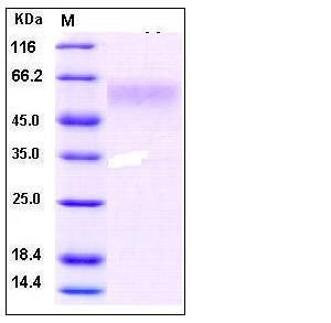 The recombinant human DR6 consists of 315 amino acids and predicts a molecular mass of 34.2 kDa. By SDS-PAGE under reducing conditions, the apparent molecular mass of rhDR6 is approximately 55-60 kDa due to the glycosylation.