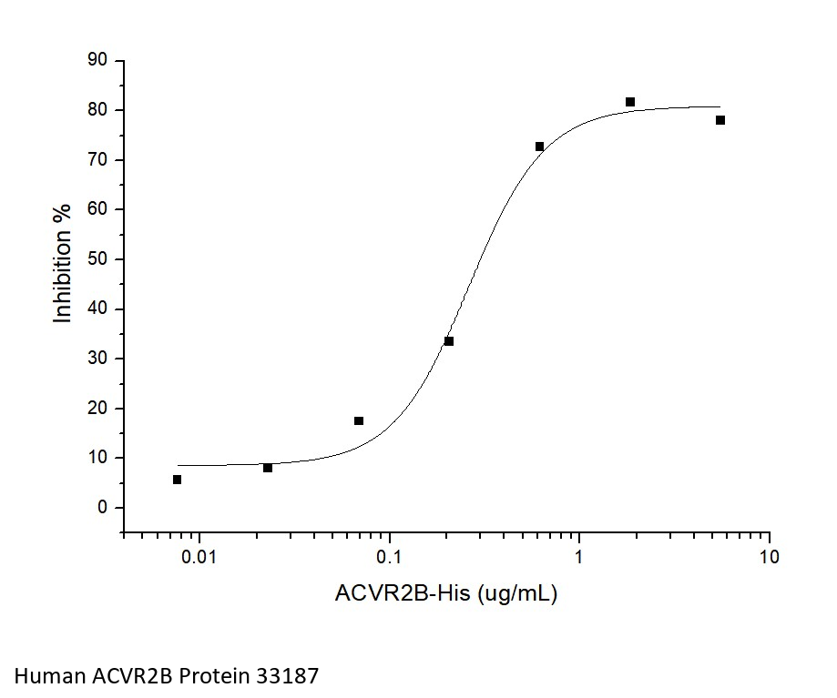 The recombinant human ACVR2B comprises 127 amino acids and predicts a molecular mass of 15 kDa. As a result of glycosylation, rh ACVR2B migrates as an approximately 33-38 kDa protein in SDS-PAGE under reducing conditions.