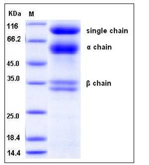 The secreted recombinant human HGF consists of 697 amino acids after cleavage of the signal peptide and has a predicted molecular mass of 79.7 kDa. The HGF single chain can be processed into the active form of disulfide-linked heterodimer of alpha and beta chain. As a result of glycosylation, it migrates with the apparent molecular mass of 90, 60 and 34 kDa corresponding to the single chain, alpha chain and beta chain respectively in SDS-PAGE under reducing conditions.