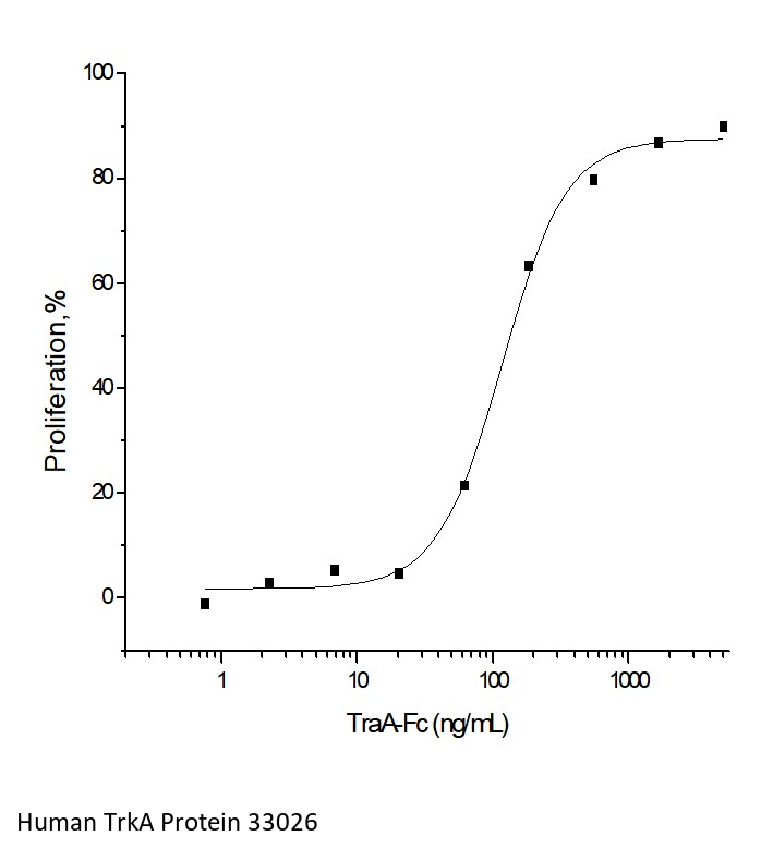 The recombinant human NTRK1/Fc is a disulfide-linked homodimer. The reduced monomer consists of 598 amino acids and has a predicted molecular mass of 66 kDa. In SDS-PAGE under reducing conditions, the apparent molecular mass of rh NTRK1/Fc monomer is approximately 85-95 kDa due to glycosylation.