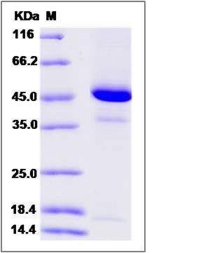 The recombinant human REG4/Fc is a disulfide-linked homodimer. The reduced monomer comprises 396 amino acids and has a predicted molecular mass of 44.3 kDa. The apparent molecular mass of the protein is approximately 45 kDa in SDS-PAGE under reducing conditions due to glycosylation.
