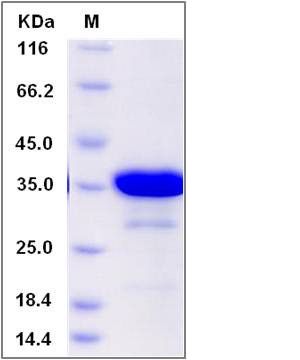 The recombinant human SAA4 /GST chimera consists of 344 amino acids and has a predicted molecular mass of 39.8KDa. It migrates as an approximately 36 KDa band in SDS-PAGE under reducing conditions.