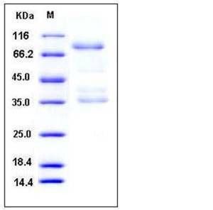 The recombinant human AGER/Fc chimera is a disulfide-linked homodimeric protein. The reduced monomer consists of 562 amino acids and predictes a molecular mass of 61.1 kDa. In SDS-PAGE under reducing conditions, the apparent molecular mass of rhAGER/Fc monomer is approximately 80-90 kDa due to glycosylation.