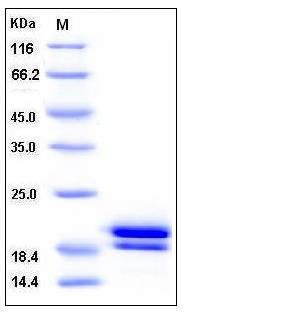 The recombinant human REG1B consists of 155 amino acids and predictes a molecular mass of 17.7 kDa. In SDS-PAGE under reducing conditions, the apparent molecular mass of rh REG1B is approximately 19-21 kDa due to different glycosylation.