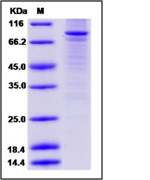 The recombinant human PPARG/GST chimera consists of 742 amino acids and has a calculated molecular mass of 85.4 kDa. It migrates as an approximately 85.4 kDa band in SDS-PAGE under reducing conditions as predicted.